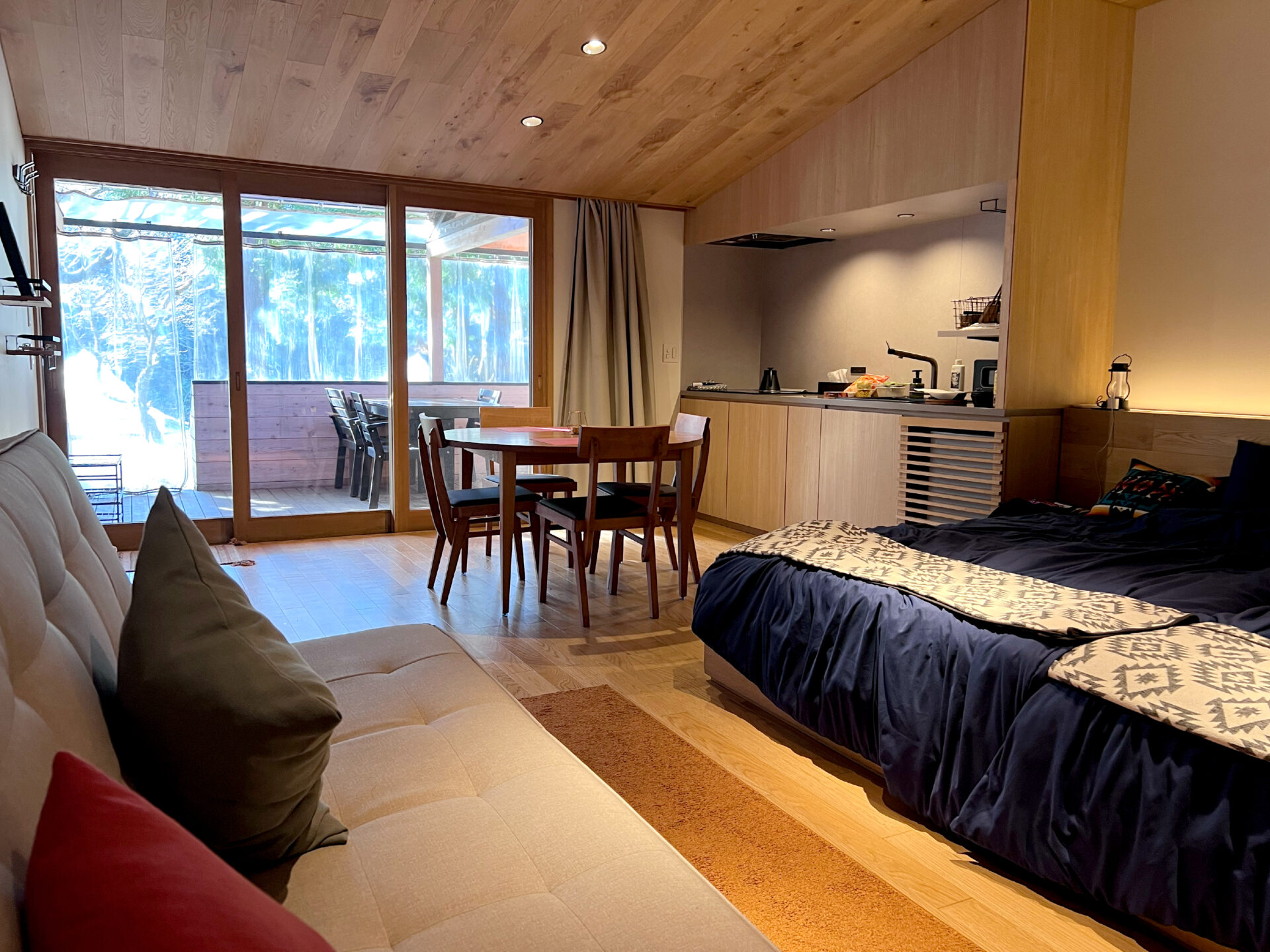 扉を開けた瞬間、木目の美しさにほっとします。天井が奥に向かって高くなるつくりもあり、室内は数字以上にのびやか。 民族調のジャガード織りクッションや、ガスランプを思わせる灯りが、木の空間に静かな遊び心を添えてくれました。