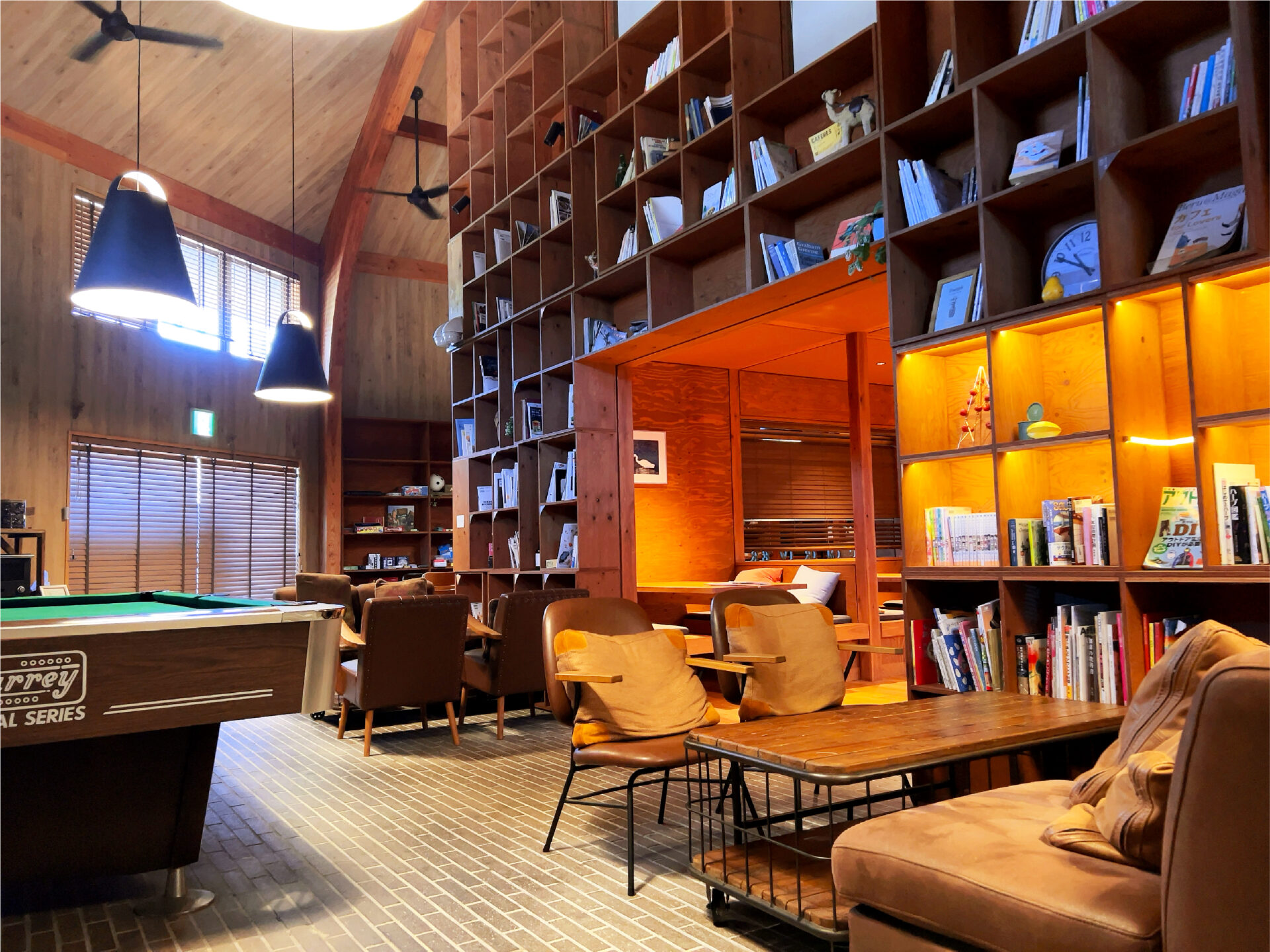 フロントのある本館には、利用者専用のラウンジがあります。天井まで伸びる本棚、フリードリンク、ビリヤード、ボードゲーム。チェックイン前・チェックアウト後にも利用できるのがありがたく、旅の余韻をゆっくり置いていけます。
