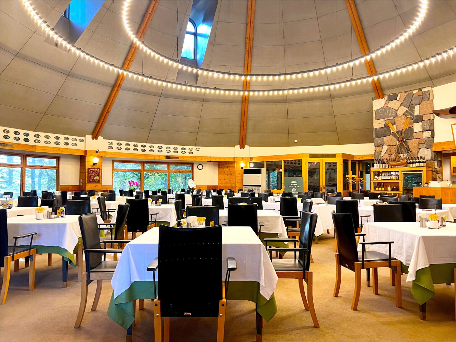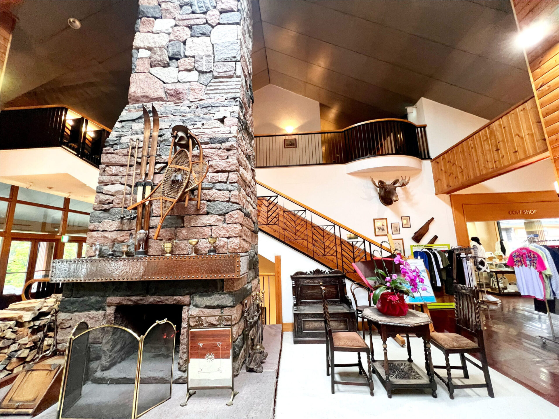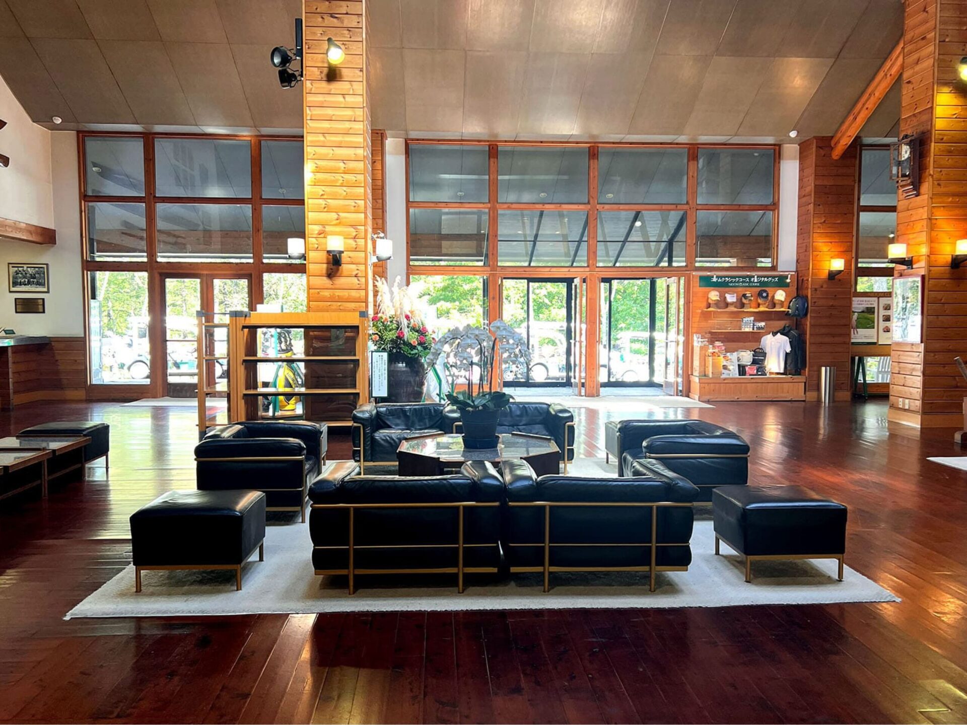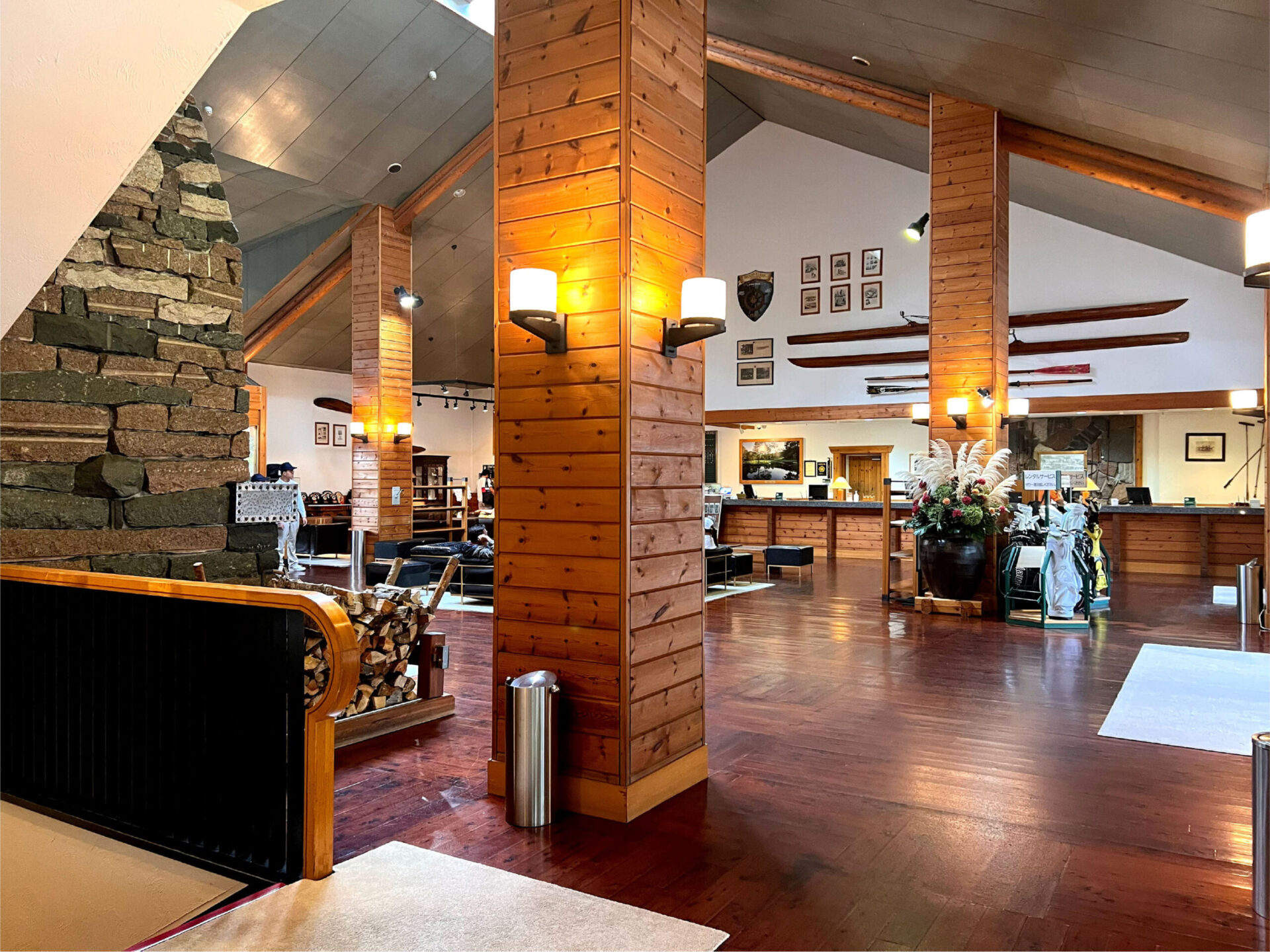 木の温もりを感じるクラブハウスは、広々としたフロントと石造りの暖炉が印象的で、北欧のロッジを思わせるような上質な落ち着きが漂っています。