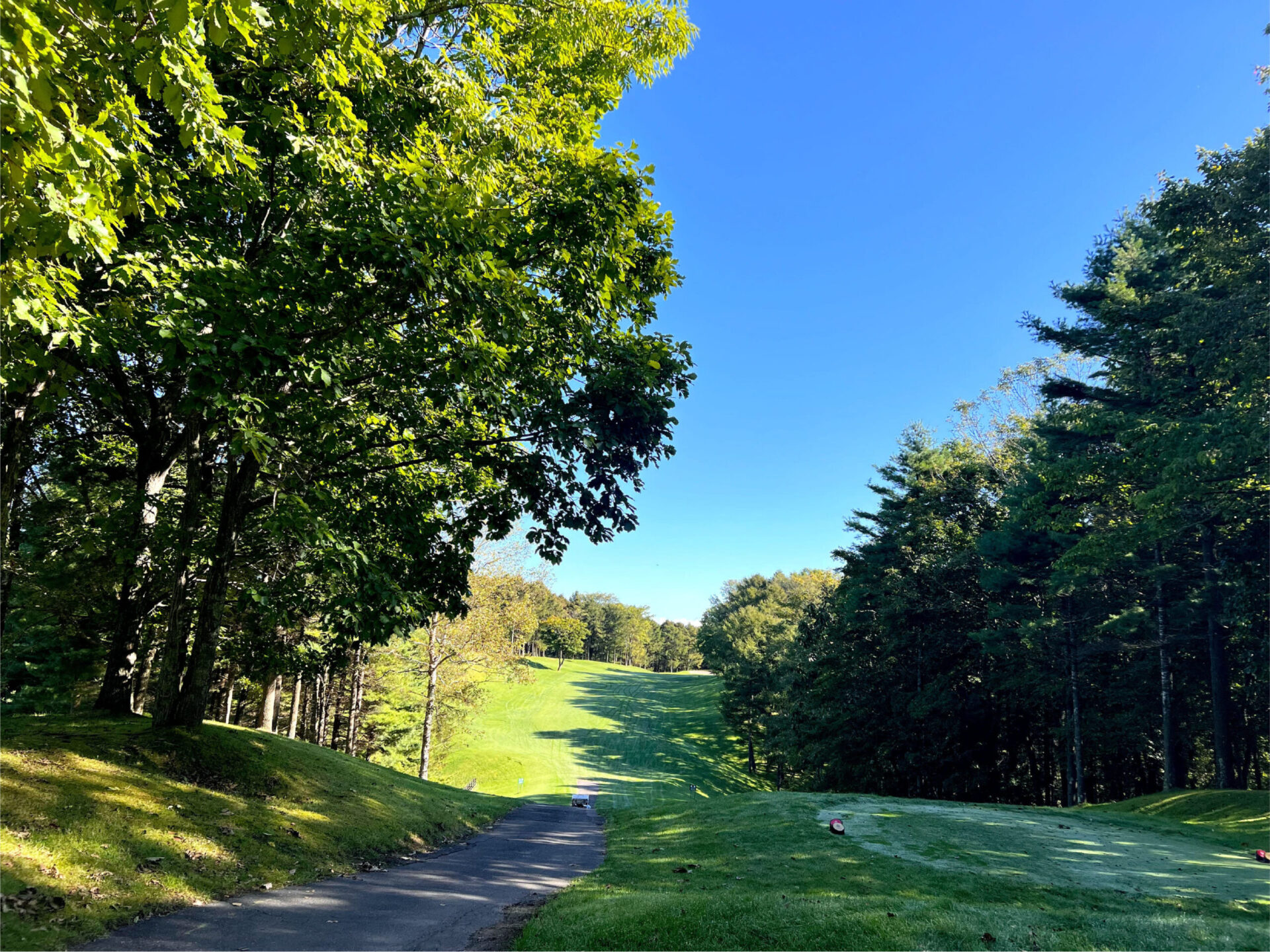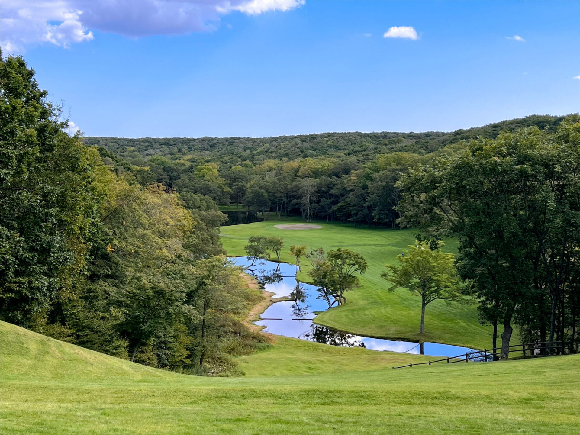 ティーグラウンドからは高い打ち下ろしになっており、真下にはクリークが流れています。 このホールでは、まずそのクリークを一打で越えなければなりません。 途中で刻むことはできず、どんなに慎重派でも“越えるしかない”という覚悟が求められます。