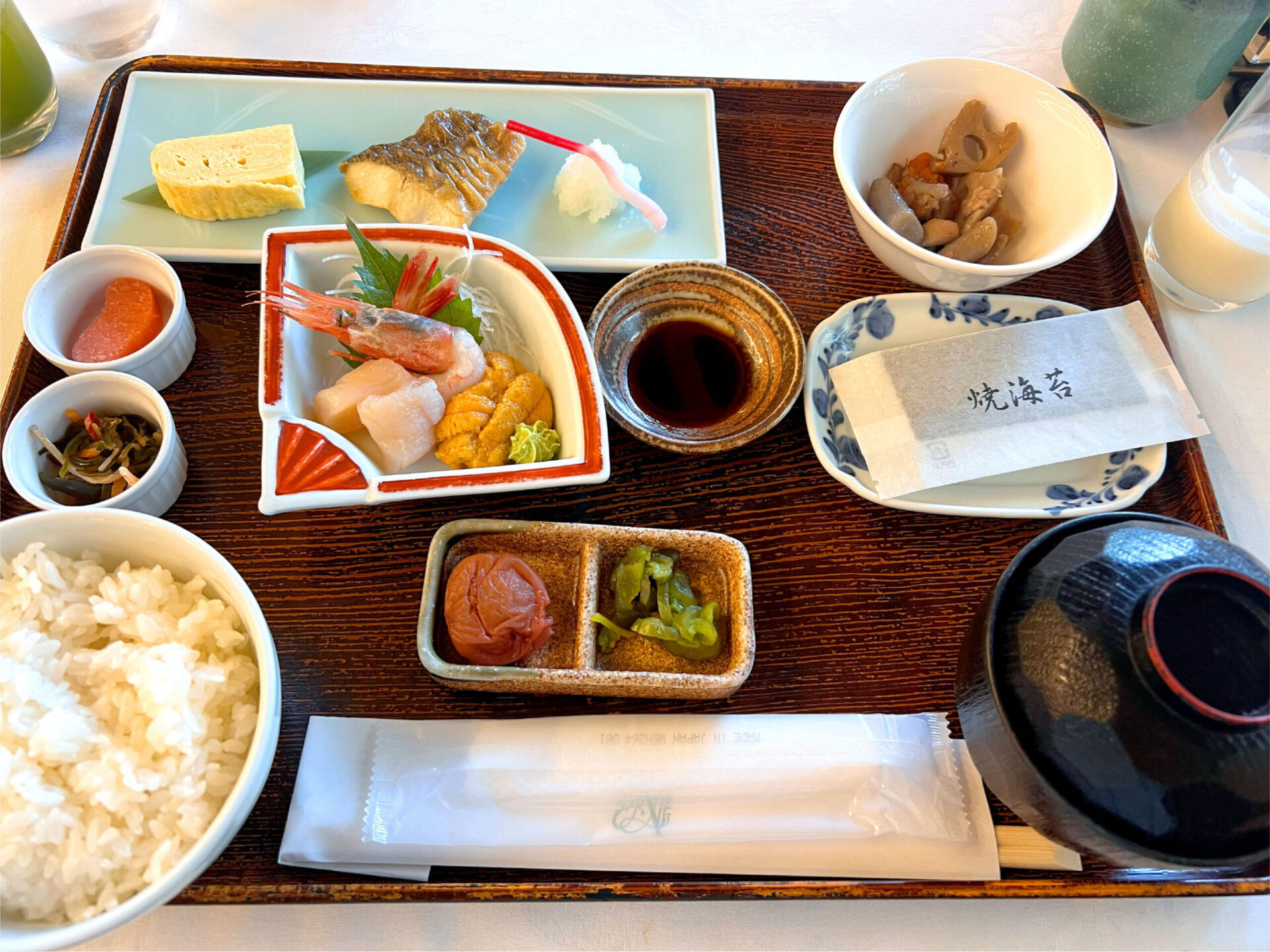 プレー前には和朝食をいただきました。 新鮮なお刺身に焼き魚、小鉢やお椀など、朝から丁寧に整えられた御膳スタイル。 中でも、私の大好物のウニが添えられていて、思わず笑顔に。 野菜ジュースや牛乳もあり、栄養バランスもばっちりでした。
