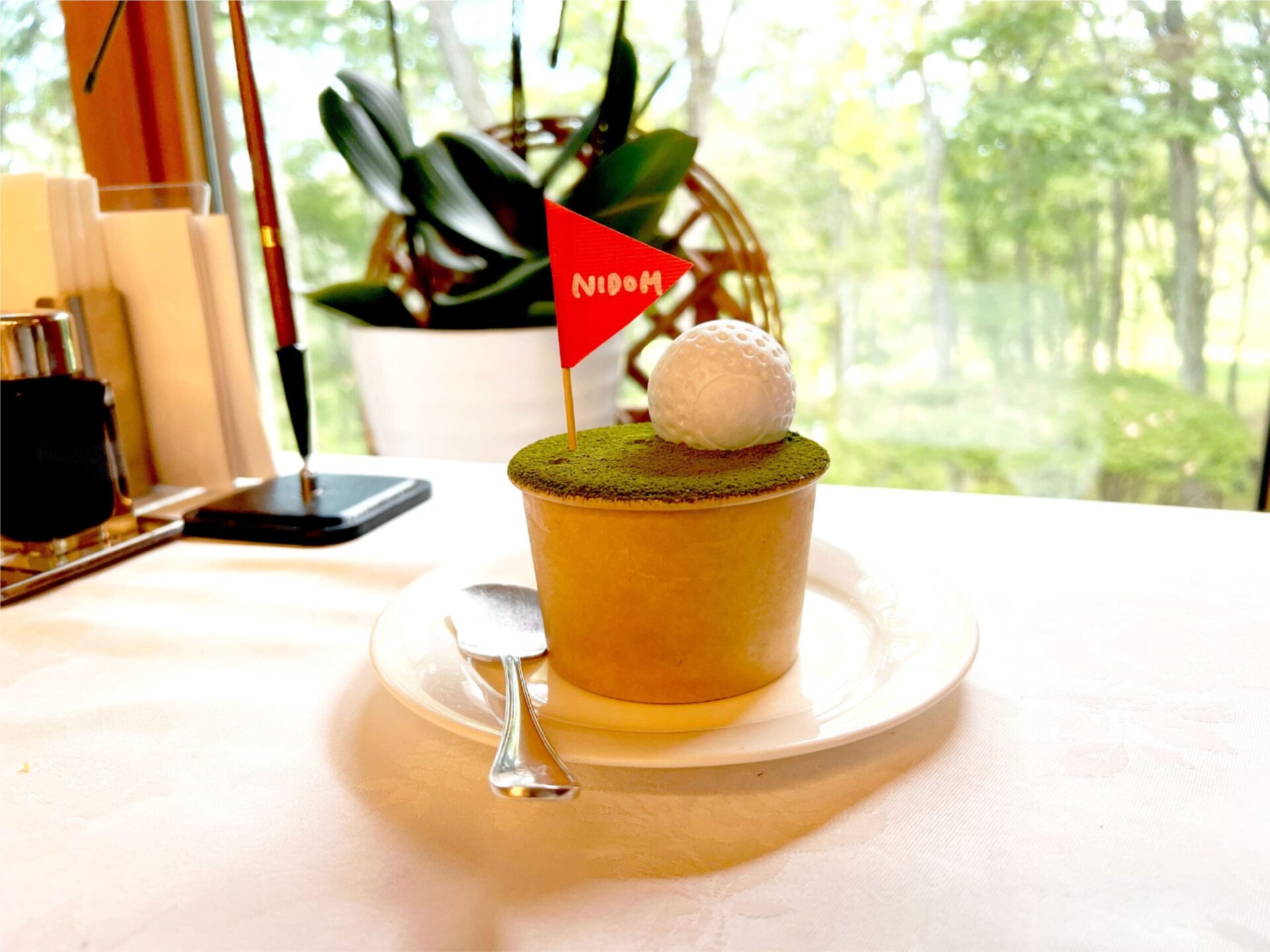 お昼は、北海道名物の「ザンギ」とビールを。 そして目を奪われたのが、グリーンを模した可愛らしいデザート。 抹茶パウダーをかけたバニラアイスの上に、真っ白なモナカの“ゴルフボール”が乗り、その中には上品なこしあん。 見た目の愛らしさと味のバランスの良さに、思わず「これは食べるしかない!」と即注文。 見た目も味も、心がほっとする北海道らしいおもてなしでした。