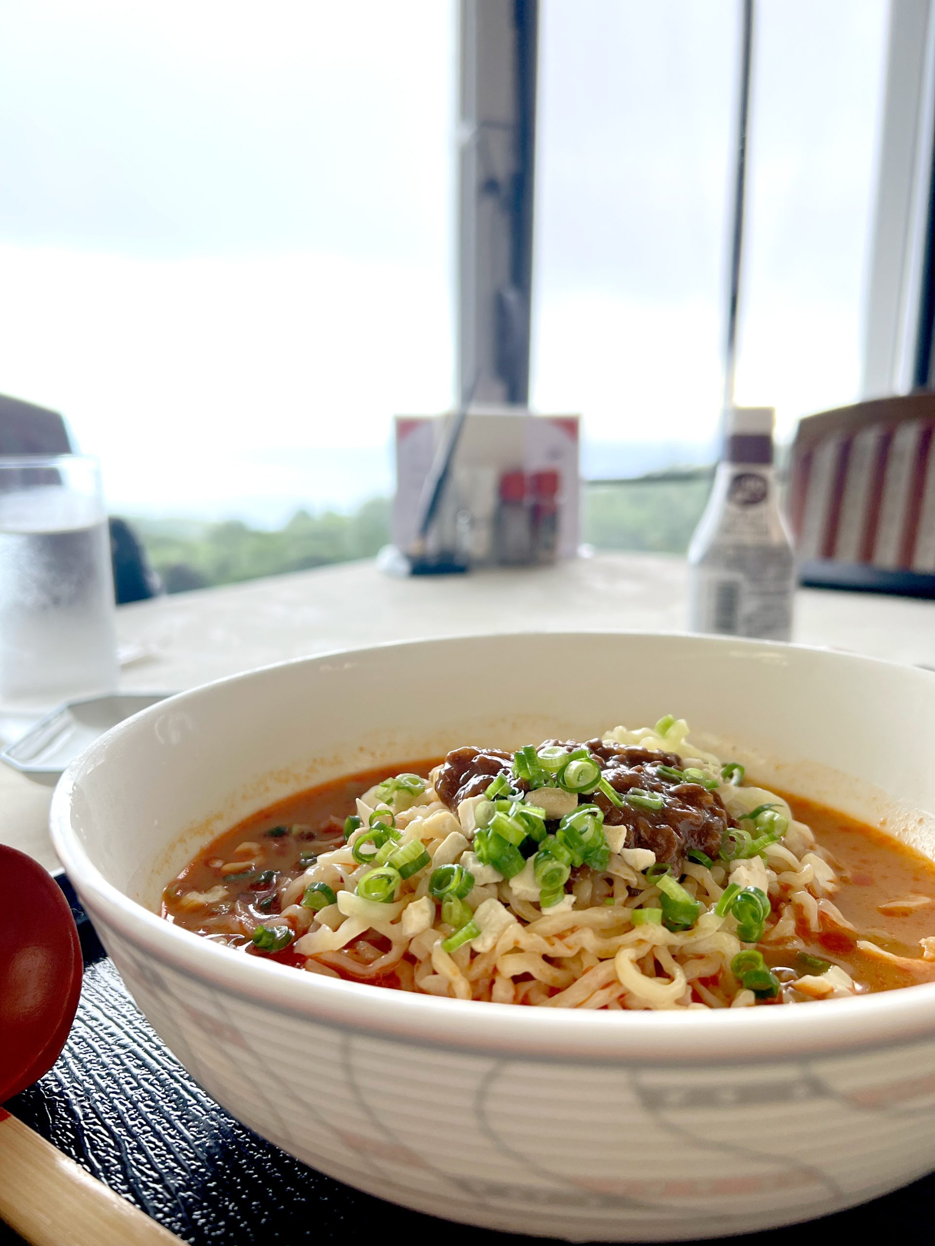 この日いただいた担々麺は、コクのあるスープともちもちの麺が絶妙で、寒さを忘れるほどの美味しさでした。レストランから眺める熱海の風景もまた、雨に霞む山々や広がる海が絵画のように美しく、特別なひとときに彩りを添えてくれました。