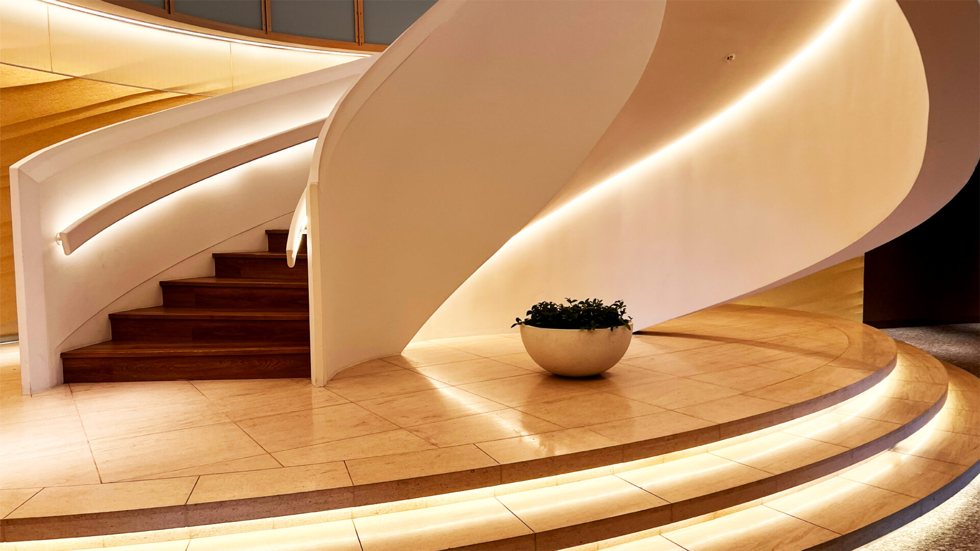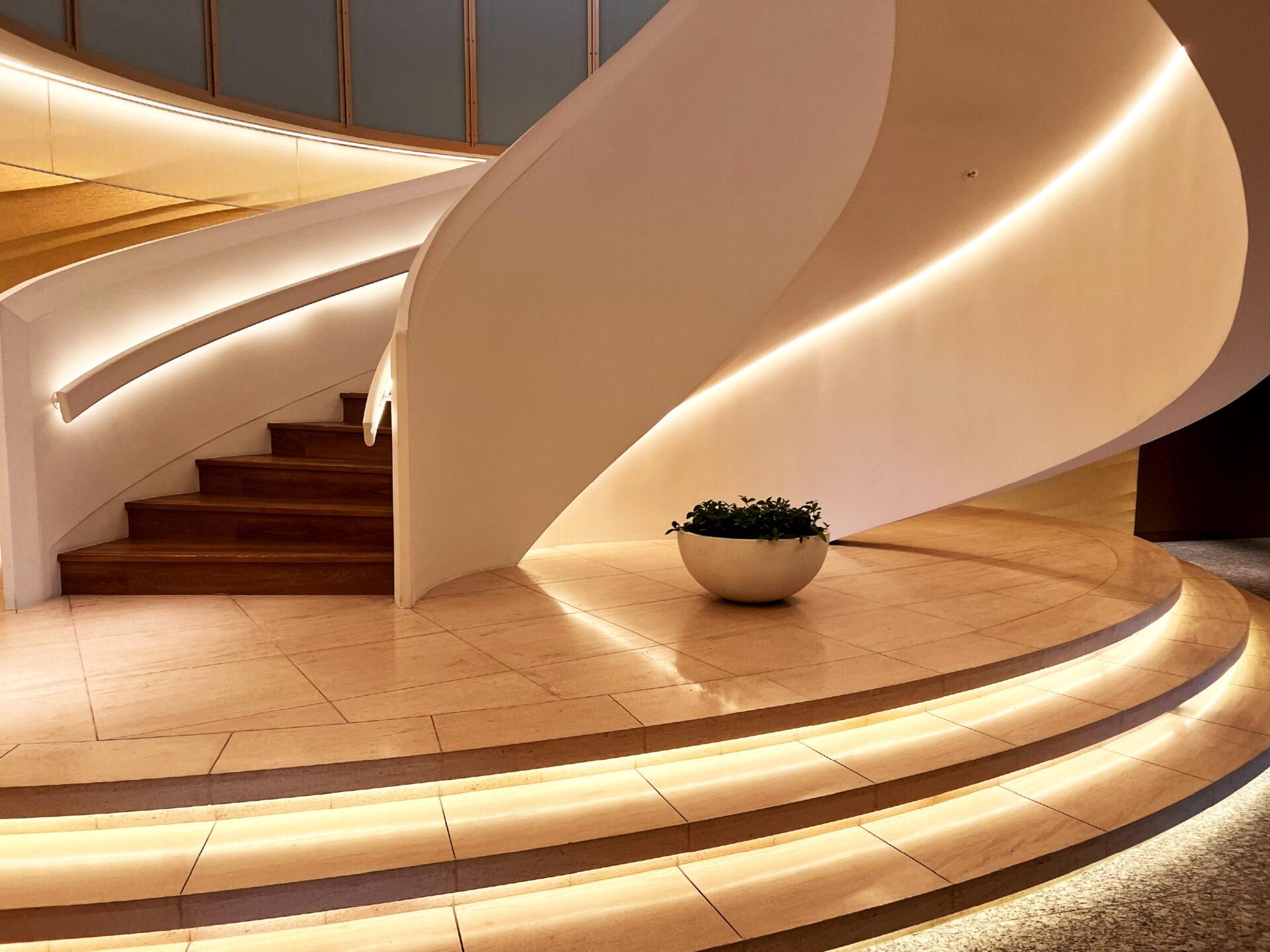 やわらかく灯るラインライトが、まるで波のゆらぎのように階段を縁取り、これから始まる非日常へそっと背中を押してくれるようでした。
