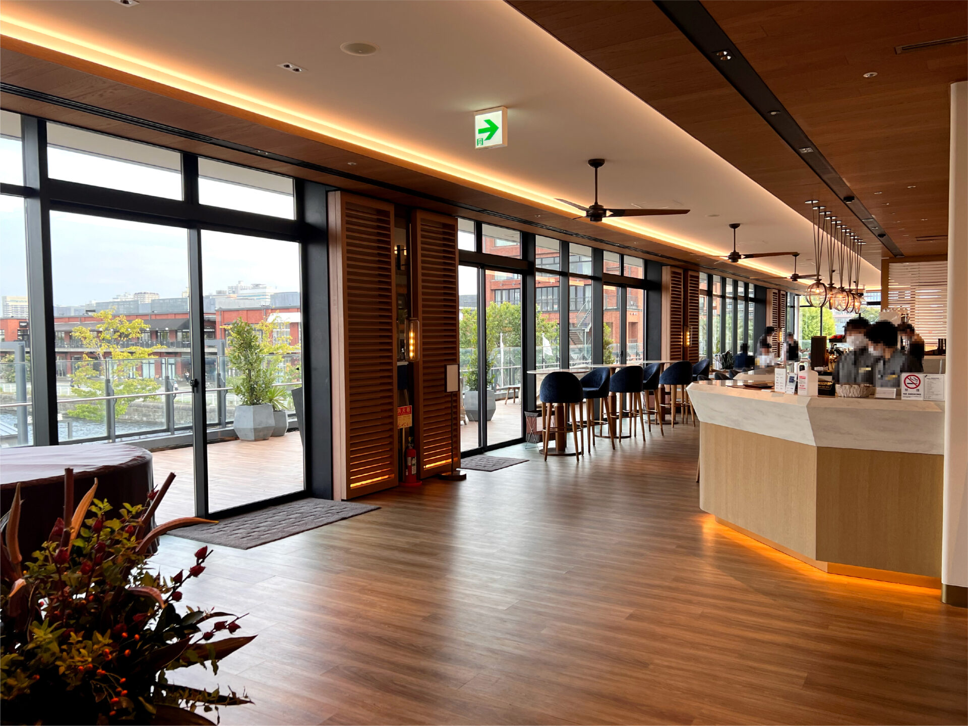 階段を上がると、大きな窓の向こうに広がる埠頭の景色。