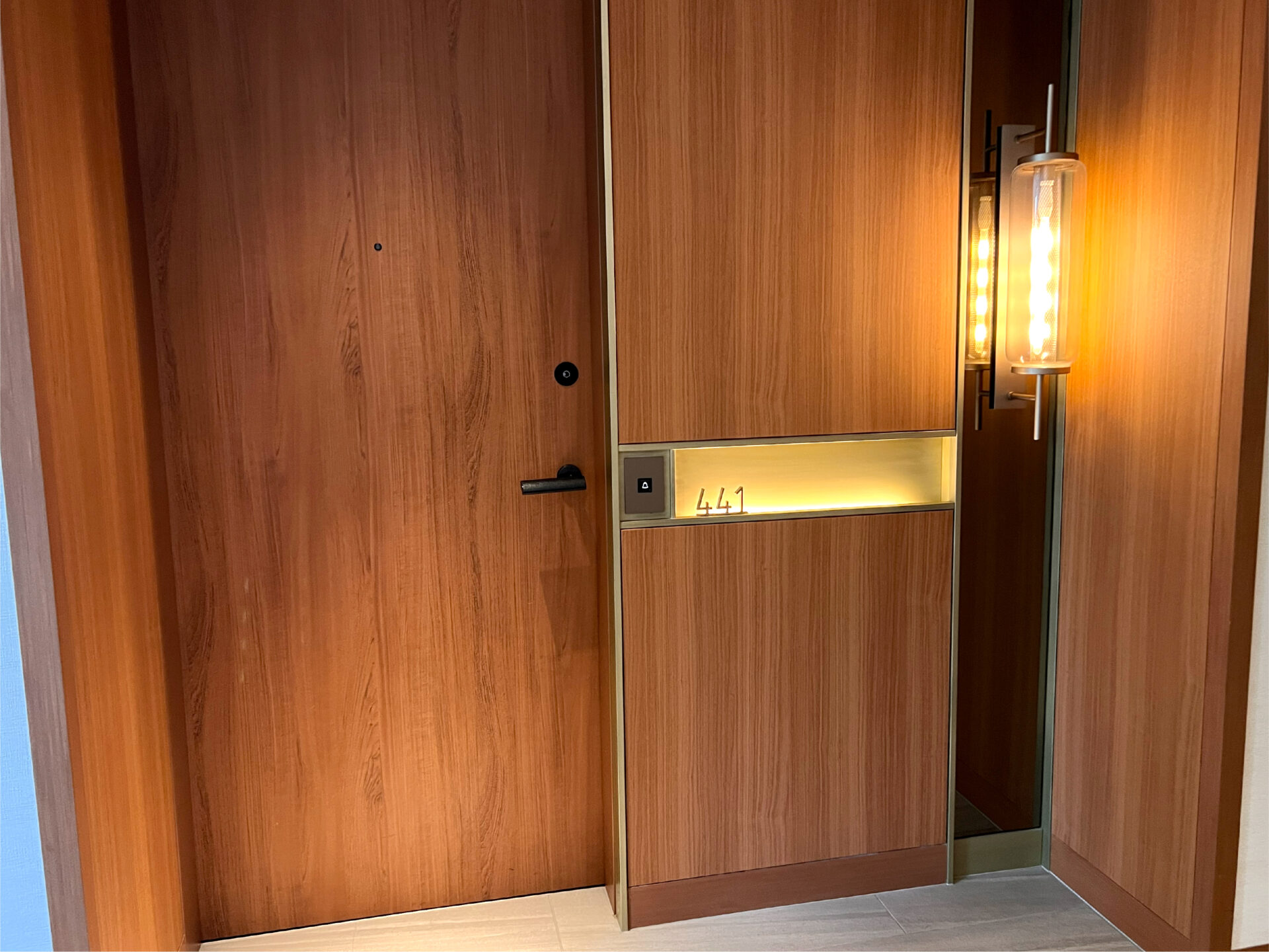 お部屋の前でまず目に留まったのは、贅沢に木をあしらった大きな扉。