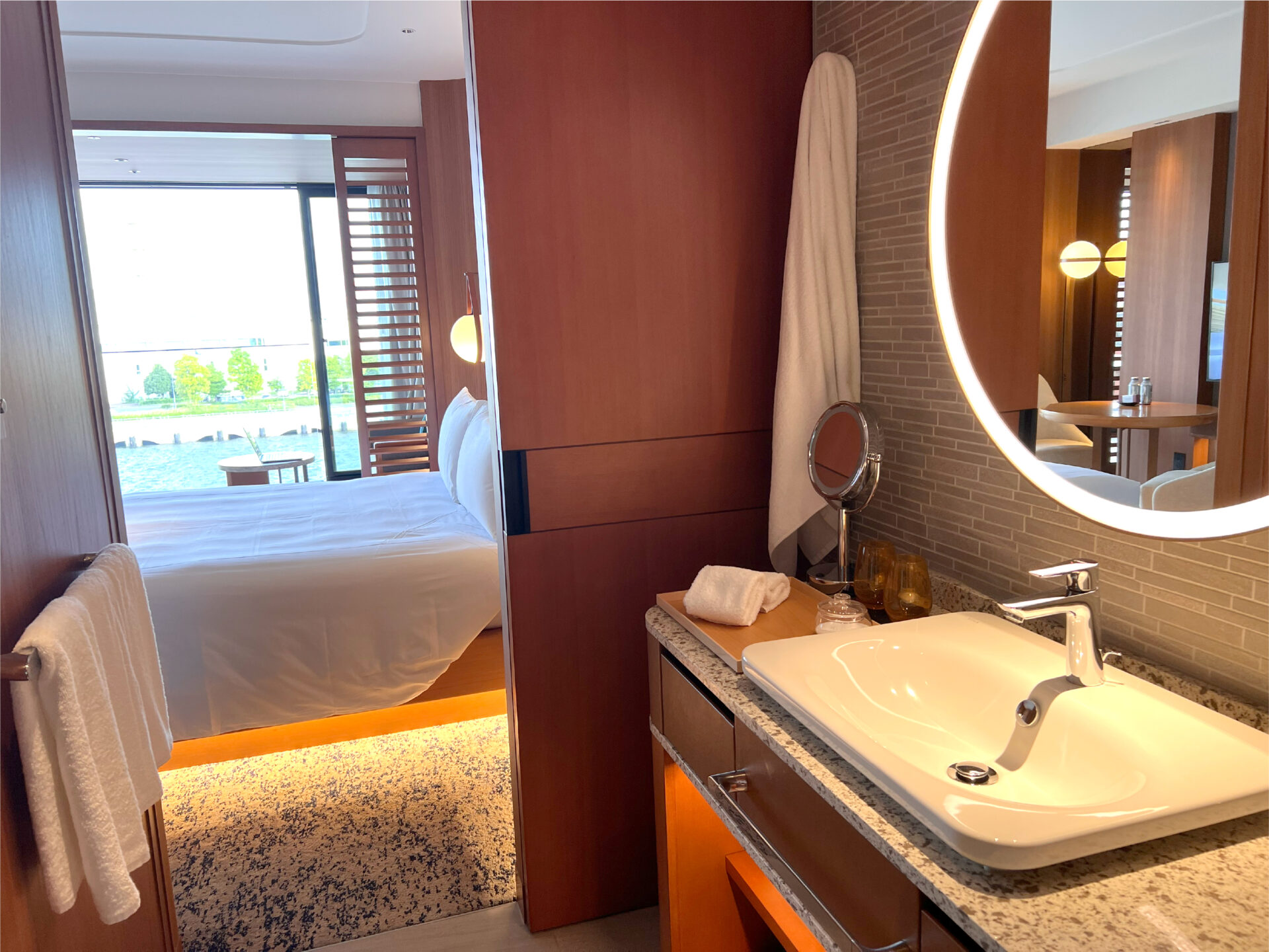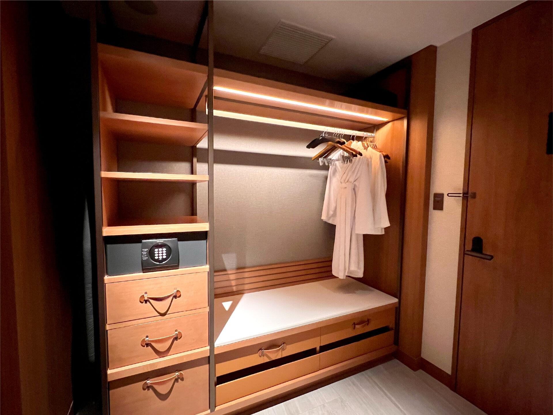 室内エントランスには広々としたクローゼットと姿見が並び、ホテルというより“私のもうひとつの部屋”のような心地よさ。