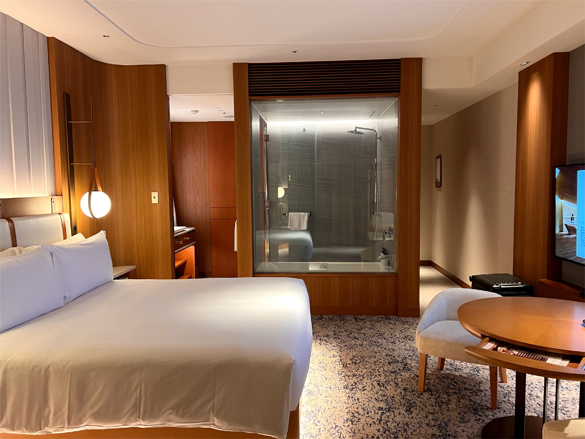スイッチひとつで透明から曇りガラスへ瞬時に変わり、プライバシーにも配慮されています。機能性と美しさが静かに調和する空間でした。