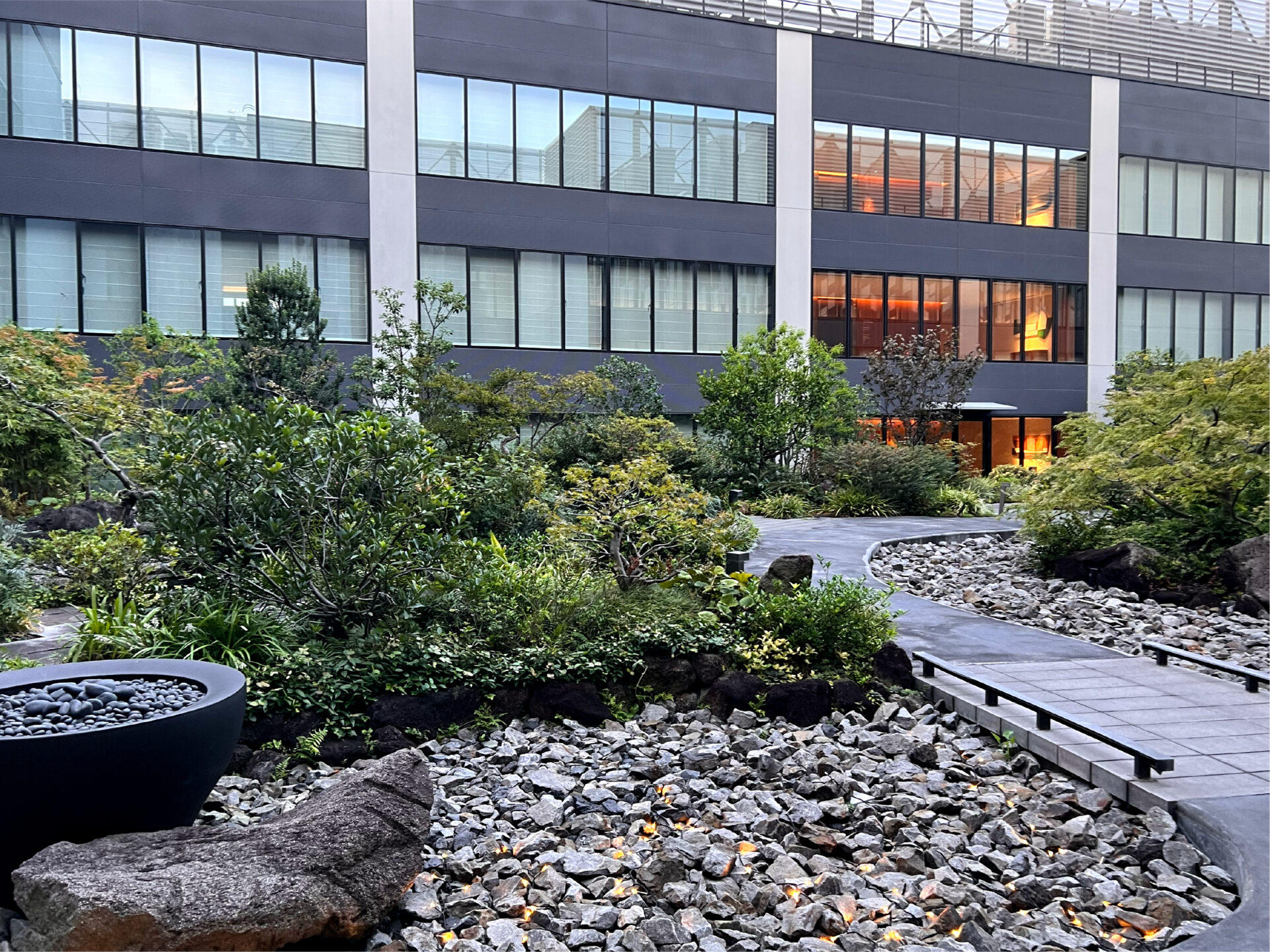 ホテル中央の中庭は、石と植物が美しく配置された静寂の空間。