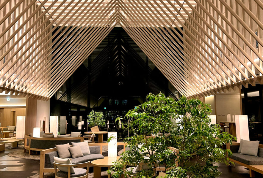 立川・国営昭和記念公園を正面に望むSORANO HOTEL。最初に心をつかまれたのは、建築そのものの説得力でした。明るい木調と大きな開口、そして窓いっぱいに広がる公園の景色。室内と外の緑が“額縁”でつながるような、静かな高揚が訪れます。
