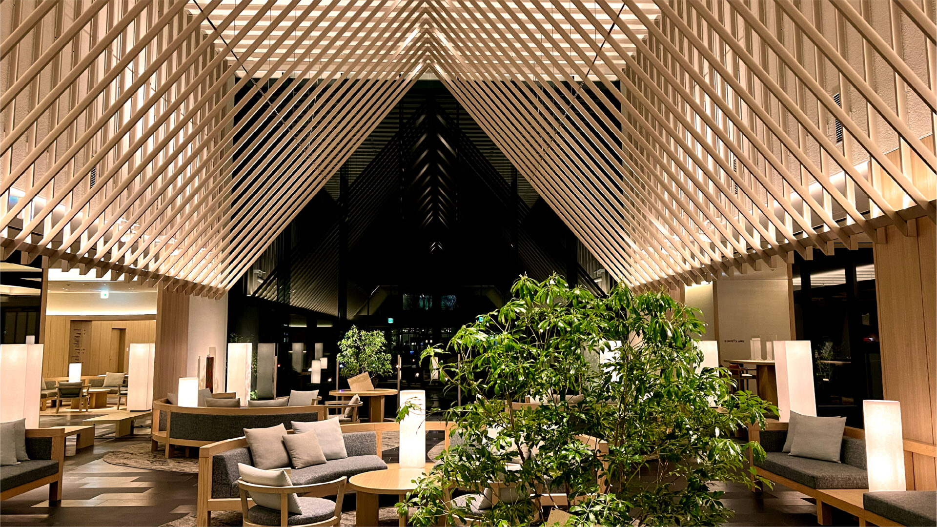 立川駅から徒歩約8分。水盤と噴水のきらめきに迎えられながら、グリーンスプリングスのテラスを上がると、イルミネーションの奥にホテルのエントランス。格子越しの光がテントのように広がり、外と中の境目がふわりと曖昧になる、その一歩から非日常が始まります。