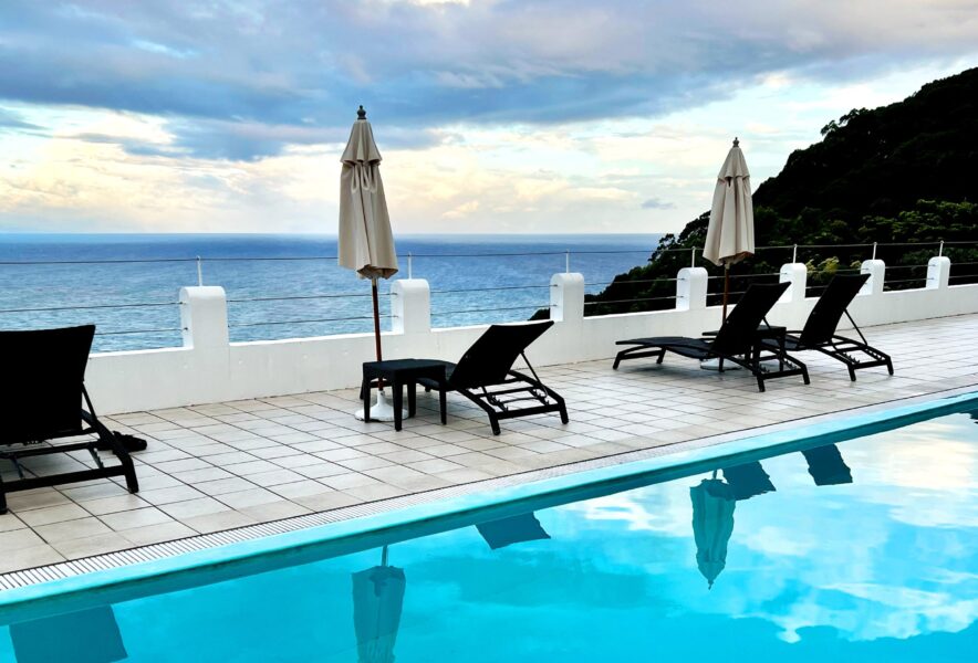昼間にはプールサイドのデッキチェアで海を眺めながら、爽やかな風を浴びつつリラックス。非日常のリゾート感を存分に楽しむことができました。